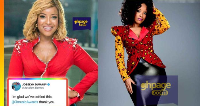The Organizers of the 3Music awards although expressed their displeasure with where she took her complaints to, they promised to pay her for her service soon and it appears they have now if Joselyn Dumas’ tweet is anything to go by.