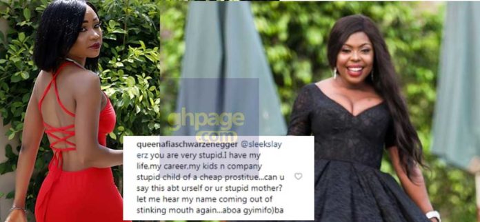 But this comment didn’t go down well with Afia as she replied to the comment by also postingย โ@sleekslayerz you are very stupid,I have my life,my career,my kids n company stupid child of a cheap prostitueโฆcan u say this abt urself or ur stupid mother?let me hear my name coming out of stinking mouth againโฆaboa gyimifo)baโ.