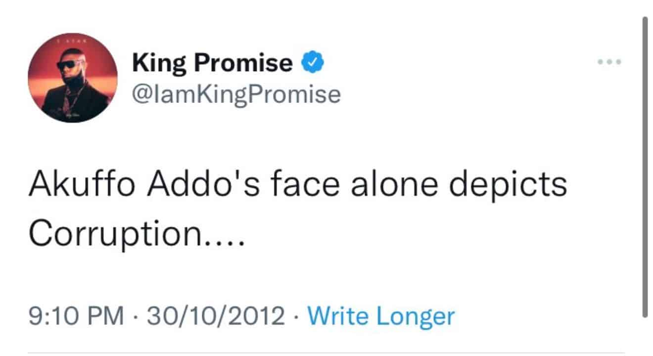 According to King Promise who is certainly anti-Nana Addo, the current president’s face alone screams massive corruption.