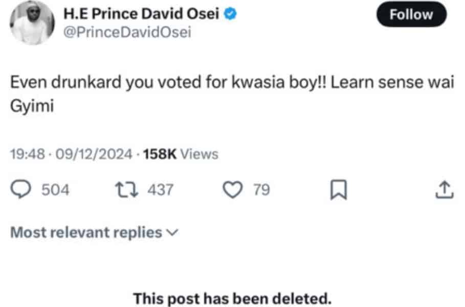 After being bashed and called all sorts of names, Prince David Osei has now deleted his post.