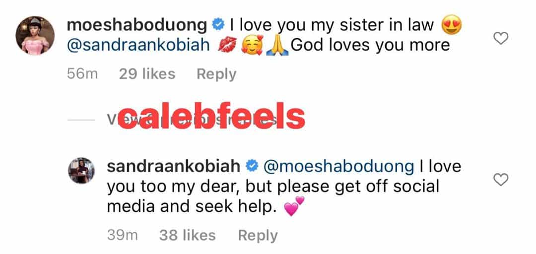 After dropping the above lengthy post that has soiled Sandra Ankobiah’s reputation, Moesha Boduong jumped to the comments section of a photo Sandra shared on her IG to address her as her in-law.