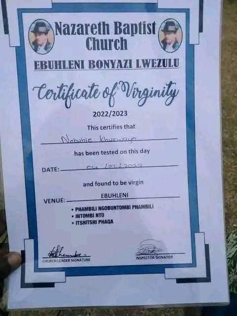 The Nazareth Baptist Church located in Ebuhleni is said to have carried out a free virginity test on unmarried ladies who attend their church and are 18 years and above.