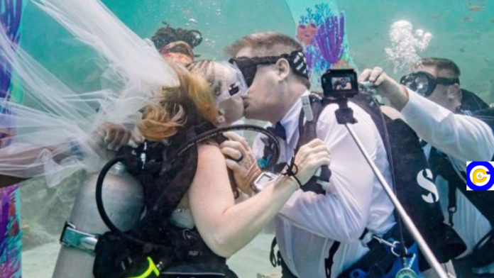A world record wedding has surfaced online as couples (Julie and Sean) have blown the minds of people as they defy logic to have their wedding underneath the sea (32ft down the sea).