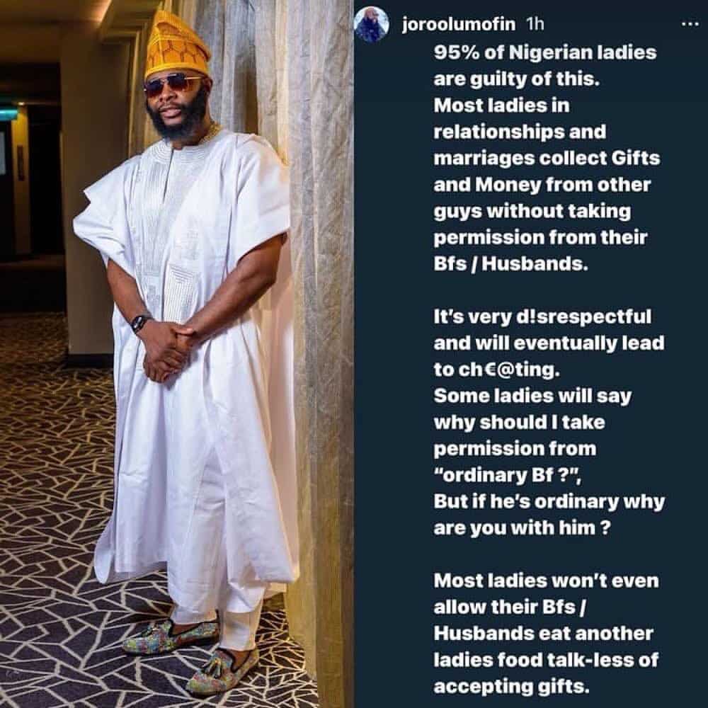 In Joro’s controversial post, he argued that consistently receiving gifts from the opposite sex might eventually lead to cheating.