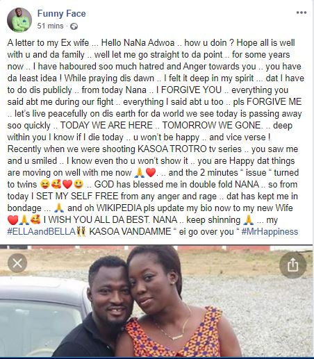 The comedian posted: “A letter to my Ex wife โฆ Hello NaNa Adwoa .. how u doin ? Hope all is well with u and da family .. well let me go straight to da point .. for some years now .. I have haboured soo much hatred and Anger towards you .. you have da least idea ! While praying dis dawn .. I felt it deep in my spirit โฆ dat I have to do dis publicly .. from today Nana .. I FORGIVE YOU .. everything you said abt me during our fight .. everything I said abt u too .. pls FORGIVE ME .. letโs live peacefully on dis earth for da world we see today is passing away soo quickly .. TODAY WE ARE HERE .. TOMORROW WE GONE. .. deep within you I know if I die today .. u wonโt be happy .. and vice verse ! Recently when we were shooting KASOA TROTRO tv series .. you saw me and u smiled .. I know even tho u wonโt show it .. you are Happy dat things are moving on well with me now ???. .. and the 2 minutes โ issue โ turned to twins ????? .. GOD has blessed me in double fold NANA .. so from today I SET MY SELF FREE from any anger and rage .. dat has kept me in bondage โฆ ? and oh WIKIPEDIA pls update my bio now to my new Wife ???? I WISH YOU ALL DA BEST. NANA .. keep shinning ? โฆ my #ELLAandBELLA???? KASOA VANDAMME โ ei go over you โ #MrHappiness”