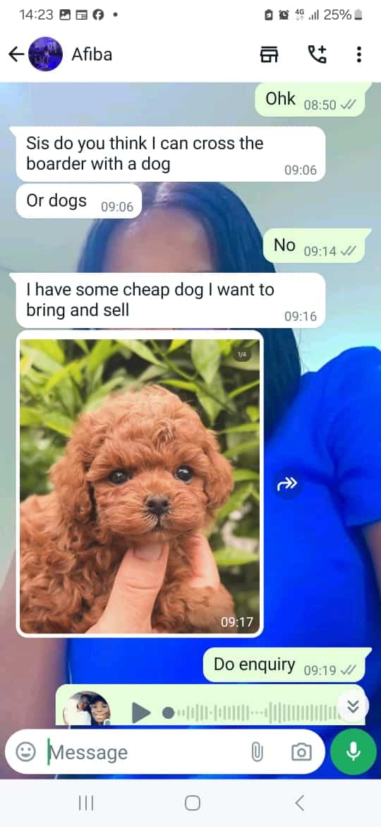 She planned to purchase dogs in Nigeria to resell in Ghana and even begged her friend to make enquiries for her if she could cross the border with the dogs.