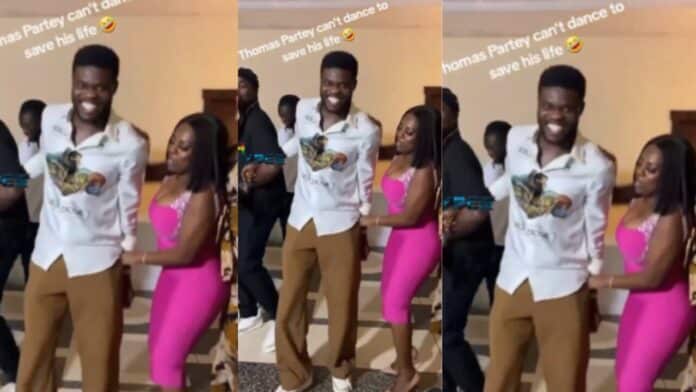 In the video, Nana Aba Anamoah can be seen playfully trying to coax a shy Thomas Partey onto the dance floor.