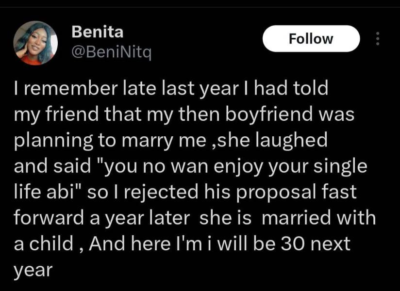 I remember late last year I had told my friend that my then boyfriend was planning to marry me ,she laughed and said “you no wan enjoy your single life abi” so I rejected his proposal fast forward a year later she is married with a child , And here I’m i will be 30 next year” She said.