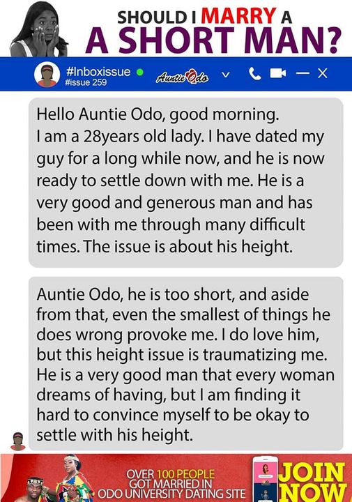 If the lady claims to love the guy as she wrote in her message, she wouldn’t think twice about marrying him because height s the least of problems anyone willing to settle down should consider.