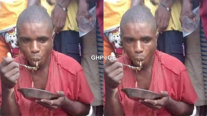 A photo that is currently fast trending on the internet show how some resident of Bayelsa community in Nigeria gave a nabbed thief indomie to eat before giving him more beatings.