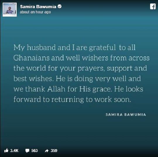 She also took the opportunity to thank Ghanaians for their good wishes, prayers, and support. In a Facebook post, Mrs. Bawumia wrote: โMy husband and I are grateful to all Ghanaians and well-wishers from across the world for your prayers, support and best wishes.โ
