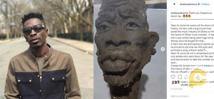 Dancehall King Shatta Wale has sent out a thank you message to the sculptor who designed his new sculpture which is currently causing a frenzy on social media because some people believe that it’s ugly.