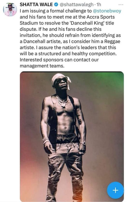 โI am issuing a formal challenge to @stonebwoy and his fans to meet me at the Accra Sports Stadium to resolve the โDancehall Kingโ title dispute.