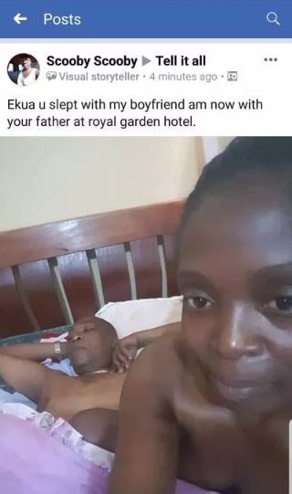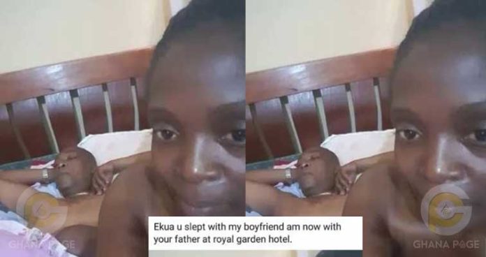 The lady in question after taking revenge on her friend by also sleeping with the friend’s father uploaded an after sex photo of them in bed and captioned it: “Ekua u slept with my boyfriend, am now with your father at royal garden hotel”.